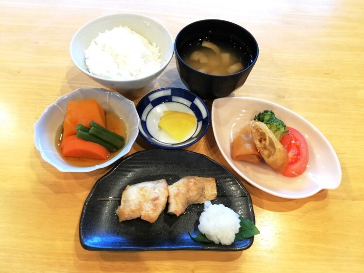 ごはん、板麩のみそ汁、赤魚の粕漬け焼き、春巻き、南瓜の炊き合わせ、たくあん漬け