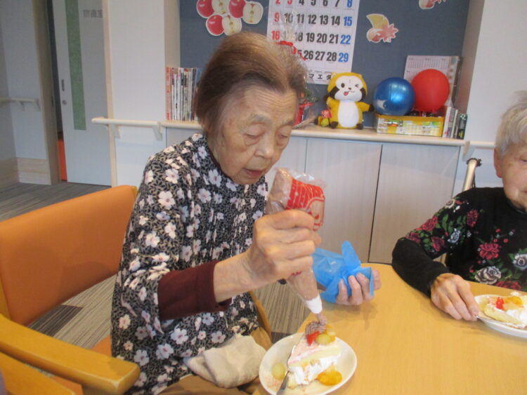 まずはお客様にケーキへデコレーションをして頂き、誕生日の歌を歌い、ケーキを召し上がりました。お客様より「今日のケーキは特別美味しい✨」と大変好評でした。その後は自分が生まれたときのお話をしたりととても盛り上がっていました。