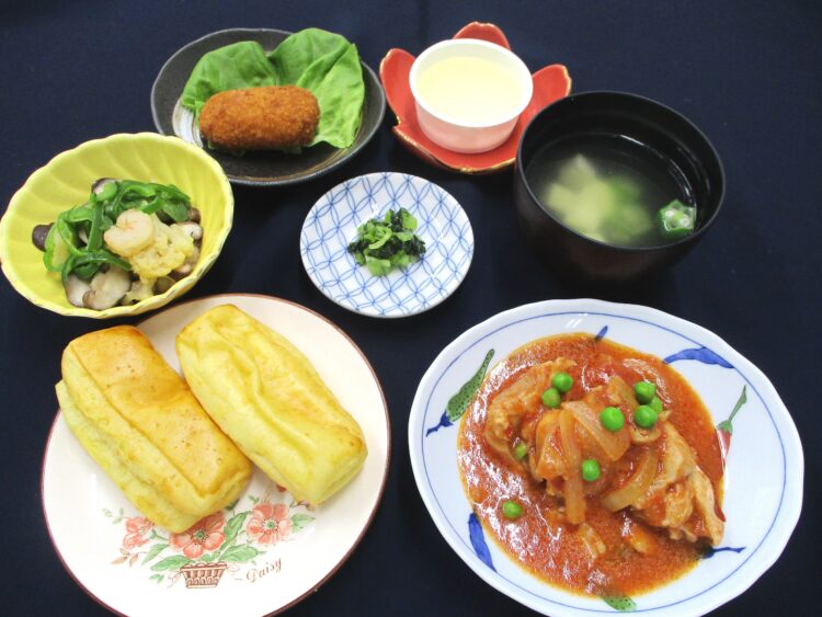 十勝バターのミニパン、豆腐とオクラのスープ、鶏肉のトマトソース煮、
