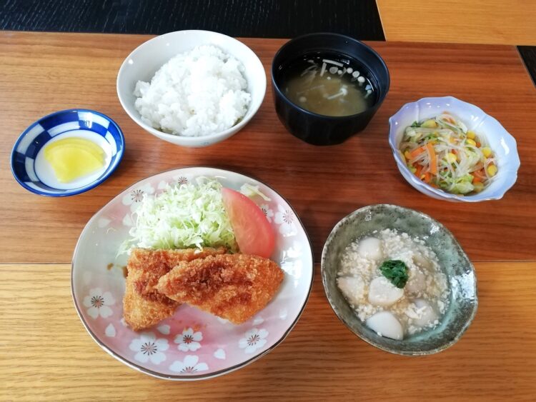 ごはん、えのきのみそ汁、かつおフライ、里芋の煮物、中華風サラダ、たくあん漬け