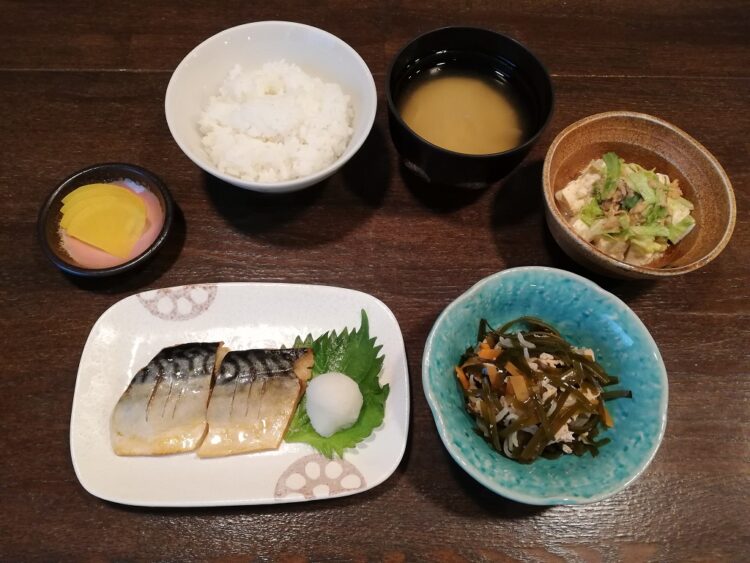 ごはん、細竹のみそ汁、さばのみりん漬け焼き、すき昆布の煮物、ツナと豆腐のサラダ、