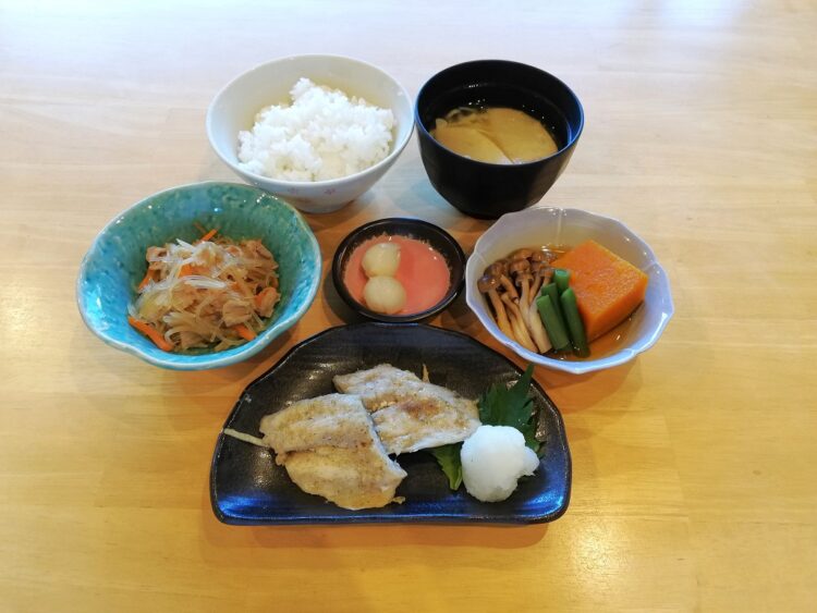 ごはん、棒麩のみそ汁、さわらのしそ風味焼き、南瓜の煮物、春雨の炒め物、らっきょう漬け