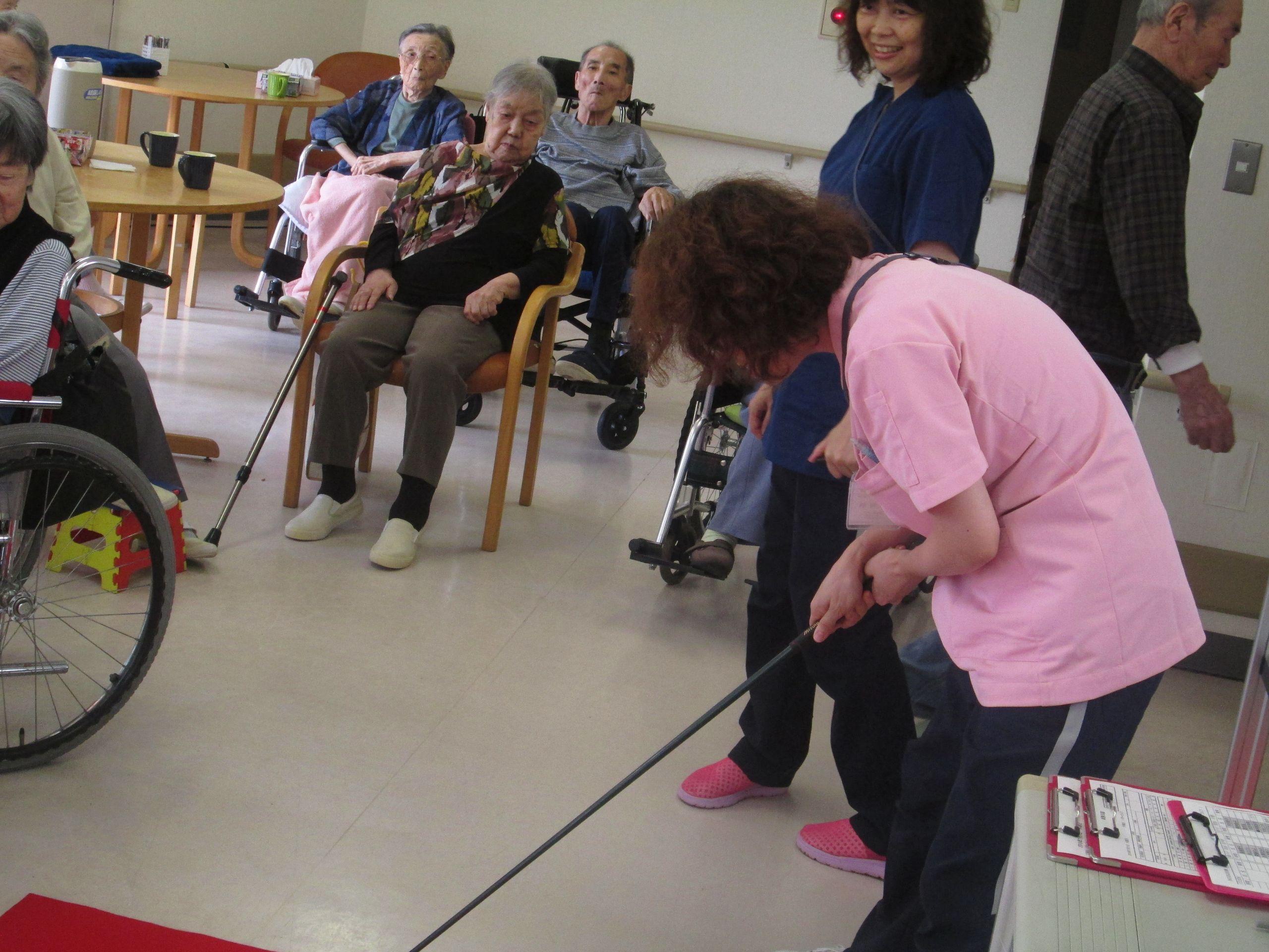 以外と難しいパターゴルフ。狙いながらステックをふる。「エイ」「あら~」の声