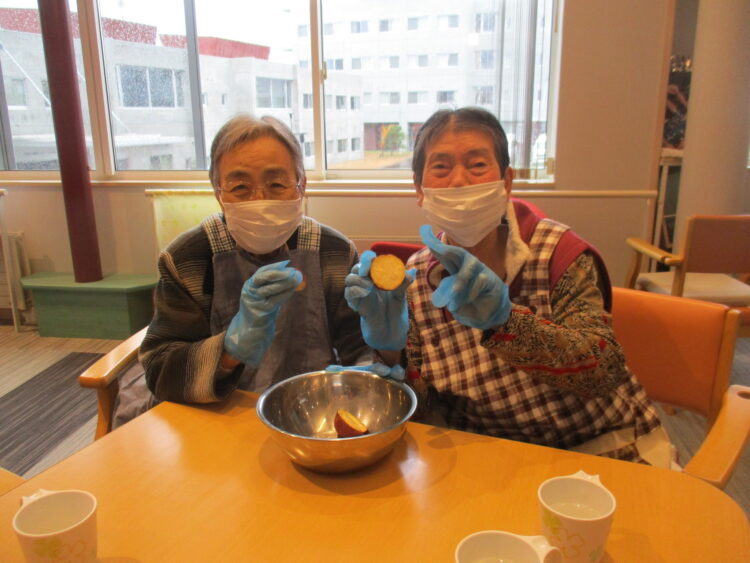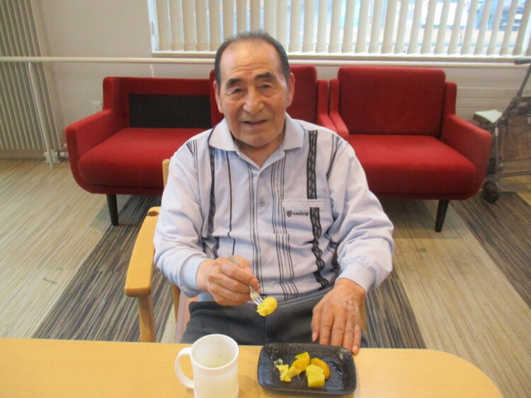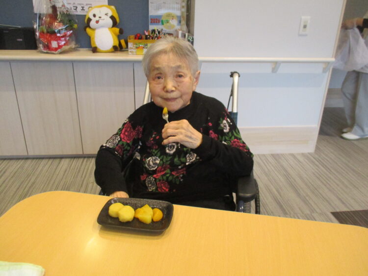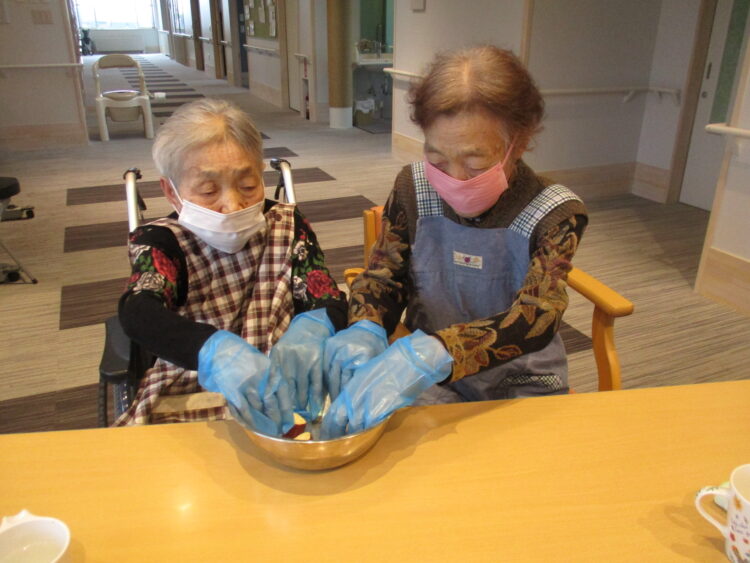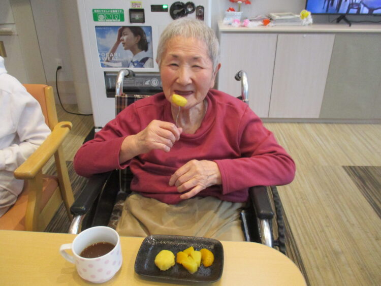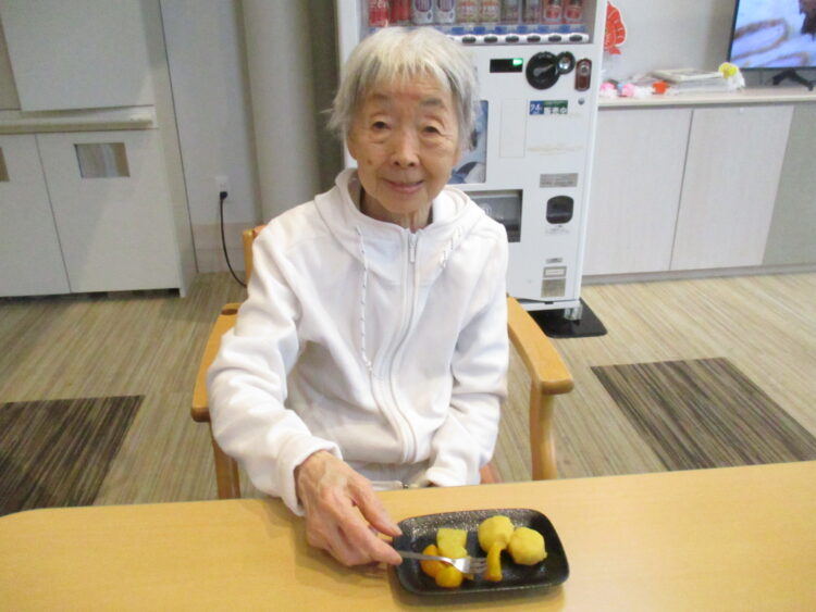 それでは本日のグループホーム城南山崎の様子をご紹介いたします。本日は調理活動といたしまして、さつまいもでスイーツ作りを行いました。柔らかく煮たさつまいもを潰して、バターと少量の牛乳と砂糖を加えて丸めました。そしてフルーツと一緒に提供しました。「どっちも美味しいね」「甘いけど果物があればさっぱりするね」と大変好評でした。