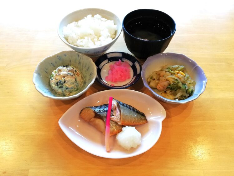 ごはん、花麩のすまし汁、さばの照り焼き、ブロッコリーの炒め物、舞茸の白和え、桜大根漬け