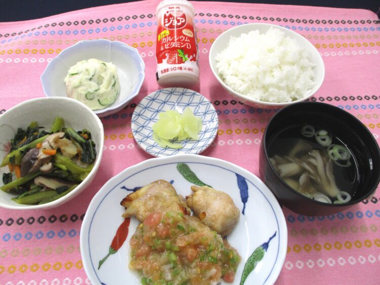 ご飯、舞茸とねぎのスープ、鶏肉のサルサソースかけ、小松菜とえびの炒め物、ポテトサラダ、