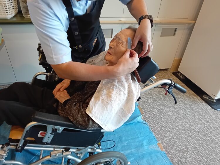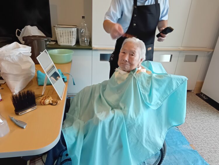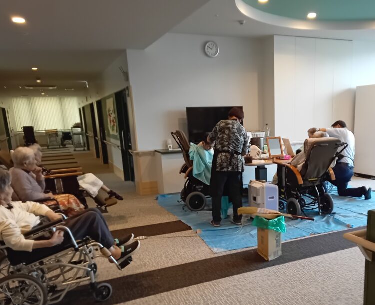 ほとんどの方が、2ヶ月に一度、ヘアカットや顔そりをしています。ホールに集まり、ワクワクしながら順番を待ち、終わった後は「さっぱりした~」といい笑顔です(*^▽^*) 「次は来年かぁ…」と、ちょっと寂しそうな表情もみられていました。