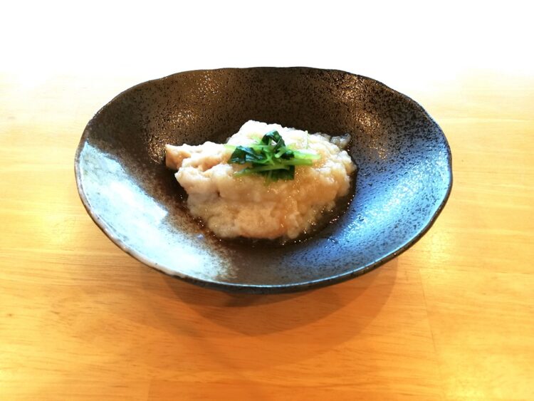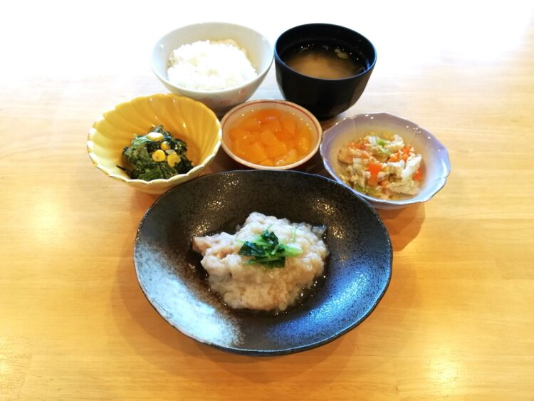 ごはん、さもだしのおろし汁、たらのとろろ蒸し、キャベツの炒め物、ほうれん草の和え物、
