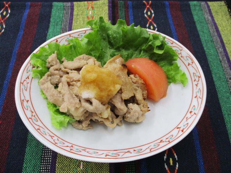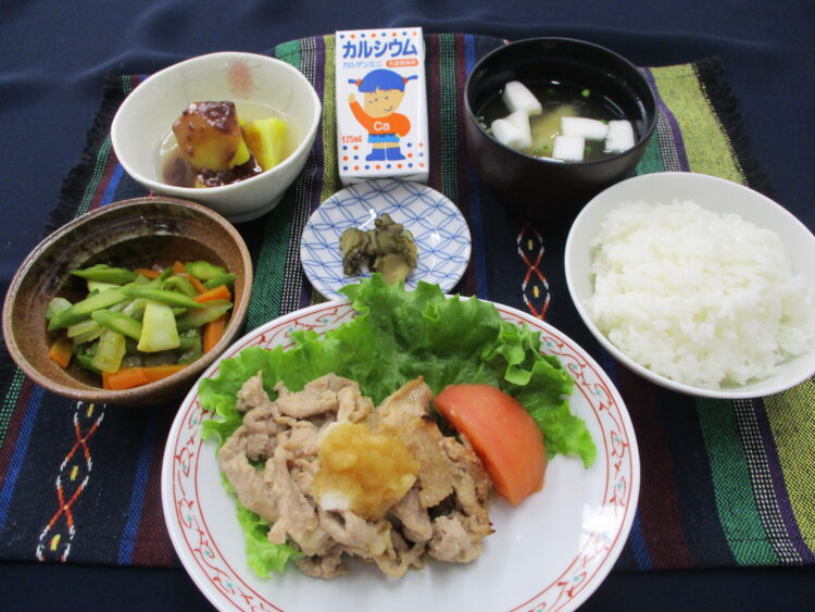 ご飯、はんぺんと万能ねぎのみそ汁、豚肉のおろしポン酢がけ、アスパラといかのカレーソテー、さつまいものいとこ煮、相馬きゅうり漬、カルゲンミニ