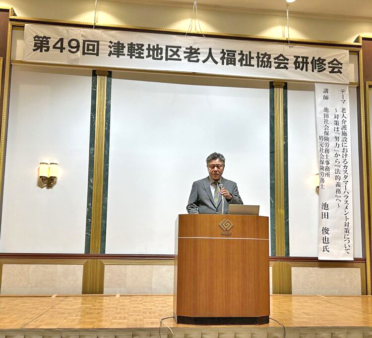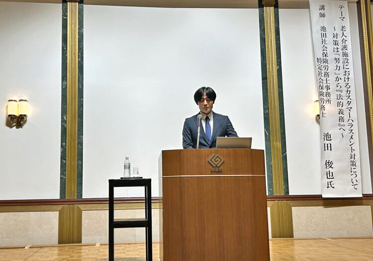 研修会は池田社会保険労務士事務所 代表 池田俊也様をお招きし、老人介護施設におけるカスタマーハラスメント対策について~対策は「努力」から「法的義務」へ~というテーマで講演が行われました。
