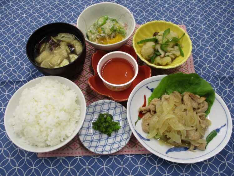 ご飯、なすと油揚げのみそ汁、ポークソテーオニオンソース、カリフラワーとえびのソテー、しらすとオクラのおろし和え、青じその実漬、ぶどうゼリー