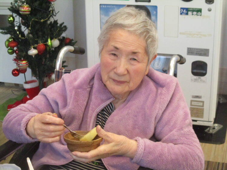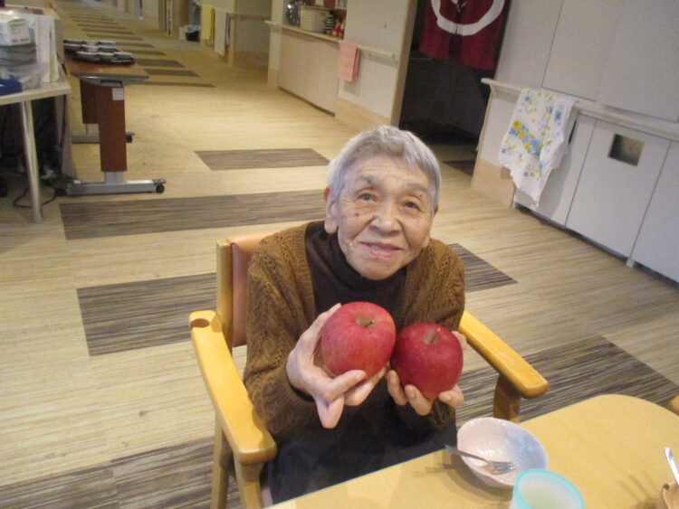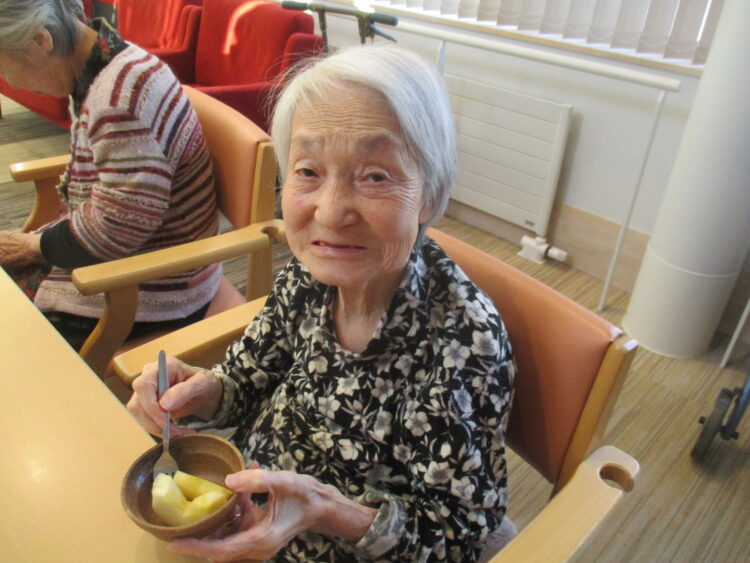 お茶会時に今の旬の果物(りんご)を提供しました。提供したところ「あれ、めずらしい、美味しそう」と目を輝かせておりました。