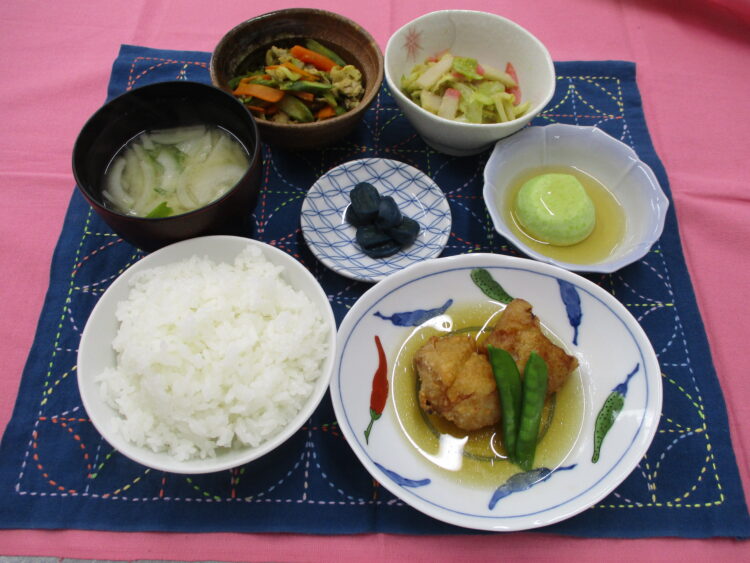 ご飯、玉葱とわかめのみそ汁、赤魚の揚げ煮、アスパラと豚肉のカレー煮、枝豆しんじょうあんかけ、キャベツのピーナッツ和え、なす漬
