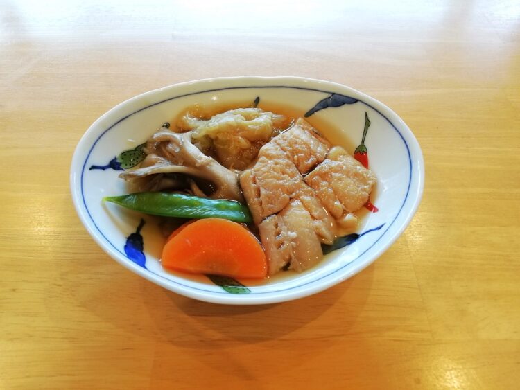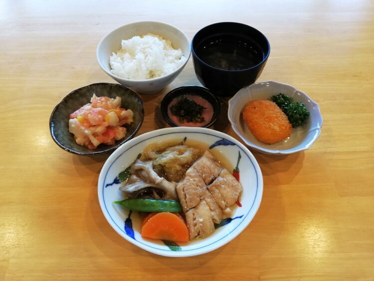 ごはん、岩のりのみそ汁、たらの寄せ鍋風、野菜コロッケ、カリフラワーサラダ、高菜漬け