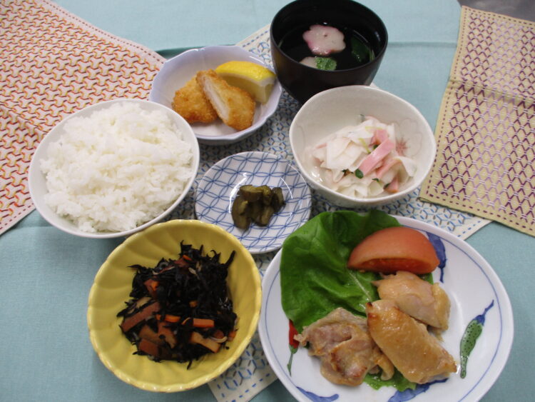 ご飯、花麩と三つ葉の清汁、鶏肉の味噌漬け焼き、ひじきの炒め煮、かぶとハムのサラダ、イカフライ、相馬きゅうり漬