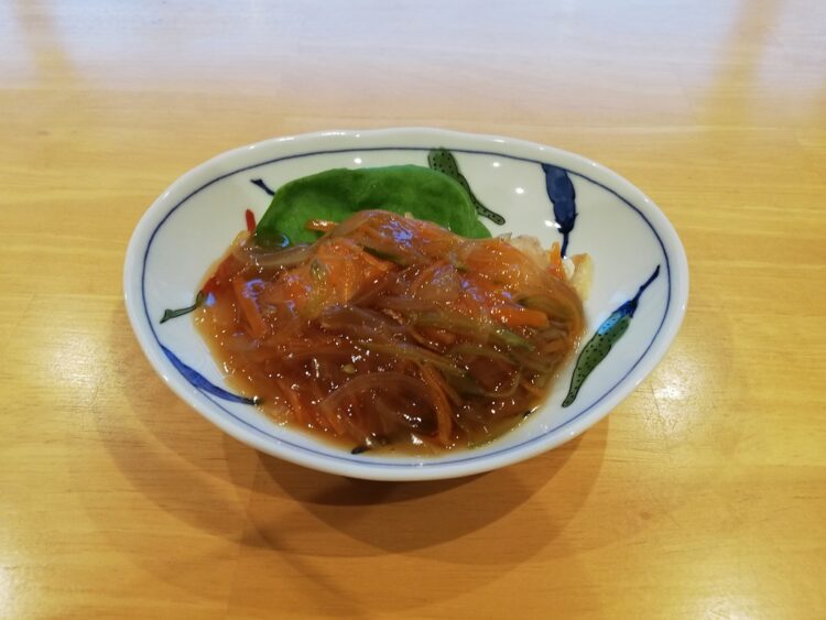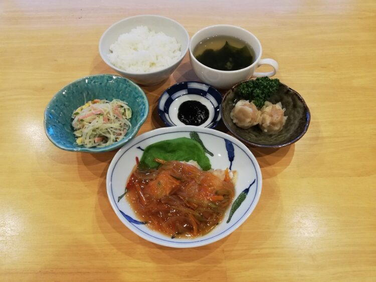 ごはん、わかめスープ、メバルの甘酢あんかけ、ポークしゅうまい、春雨とハムのサラダ、