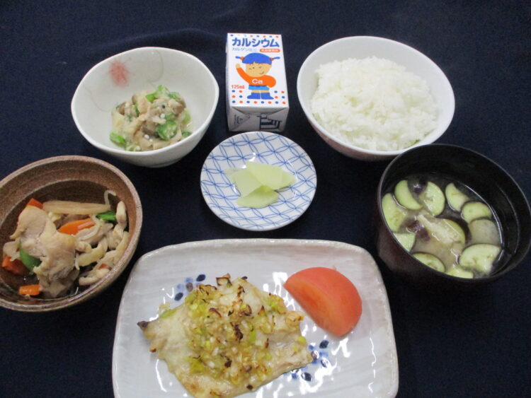 ご飯、なすと油揚げのみそ汁、さばの薬味焼き、れんこんと鶏肉の炒り煮、オクラとツナのおろし和え、べったら漬、カルゲンミニ