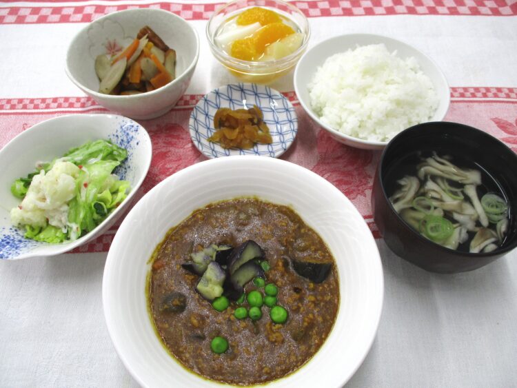 ご飯、舞茸とねぎのスープ、なすとひき肉のカレー、レタスとカニカマのサラダ、