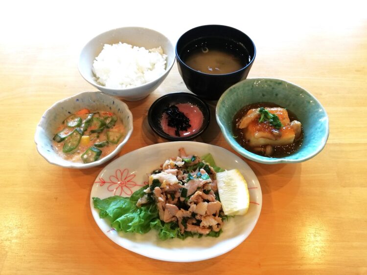 ごはん、ぜんまいのみそ汁、豚肉の薬味焼き、豆腐のおろしがけ、トマトサラダ、しそ昆布