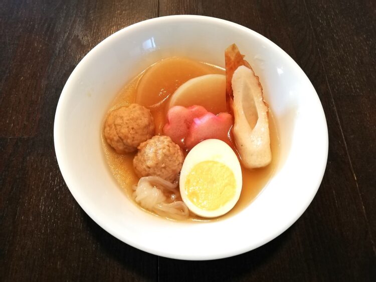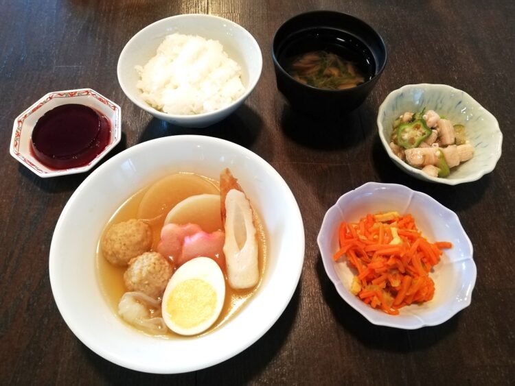 ごはん、椎茸のすまし汁、おでん、人参しりしり、長芋の梅肉和え、グレープゼリー