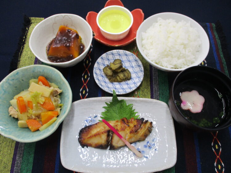 ご飯、花麩と万能ねぎの清汁、あじの西京焼き、白菜とたけのこの中華炒め、南瓜のいとこ煮、相馬きゅうり漬、はちみつゆずゼリー