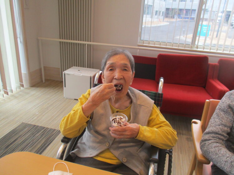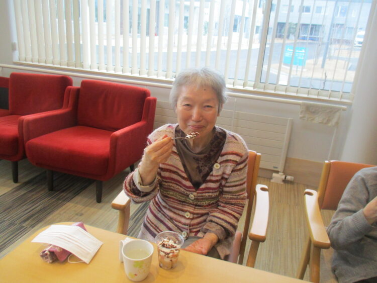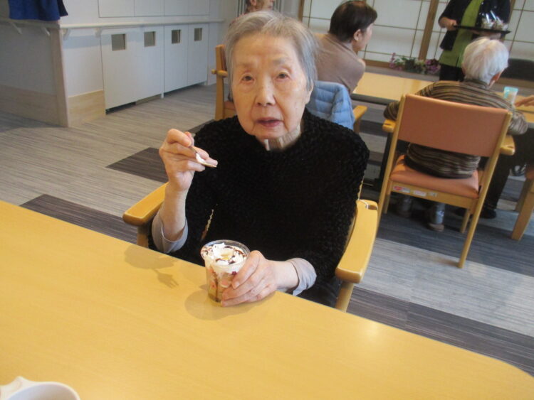 バウムクーヘンにホイップクリームやチョコソースを載せてミニパフェを提供しました。皆様「とても美味しいです」と話されておりました。