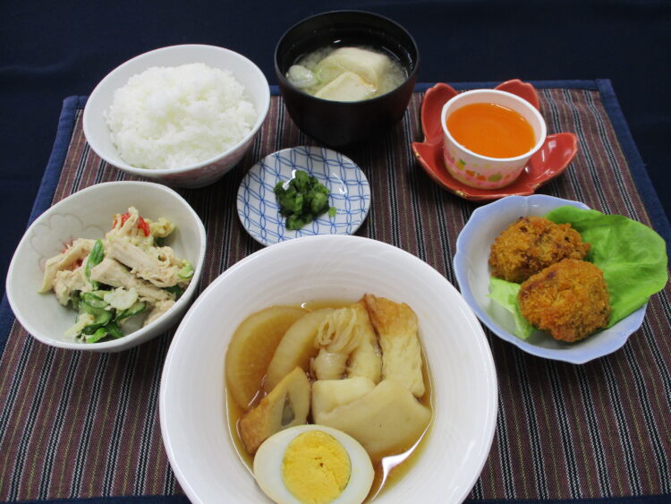 ご飯、棒麩とねぎのみそ汁、おでん鍋、アスパラとささみのサラダ、ピーマンの肉詰めフライ、野沢菜漬、キャロットゼリー