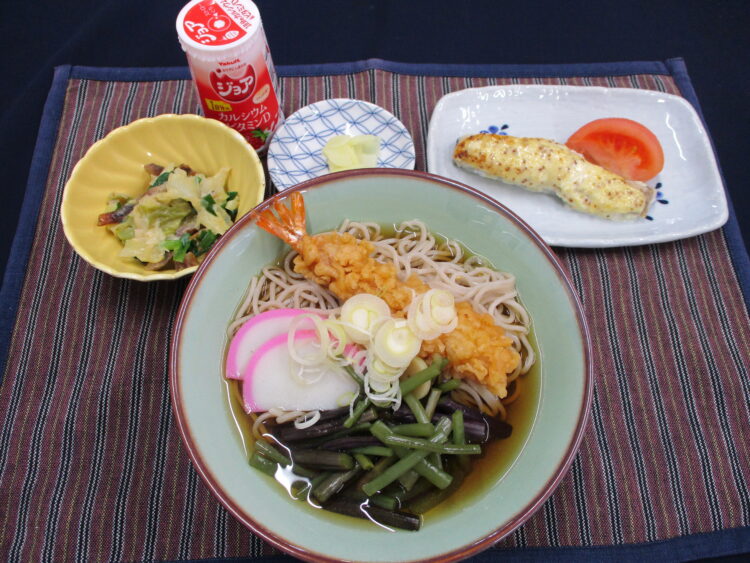 年越しそば、ホキのマスタードソテー、身欠きにしんの酢味噌和え、豆腐シュウマイ、べったら漬、ジョアストロベリー