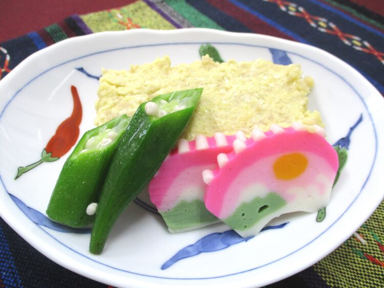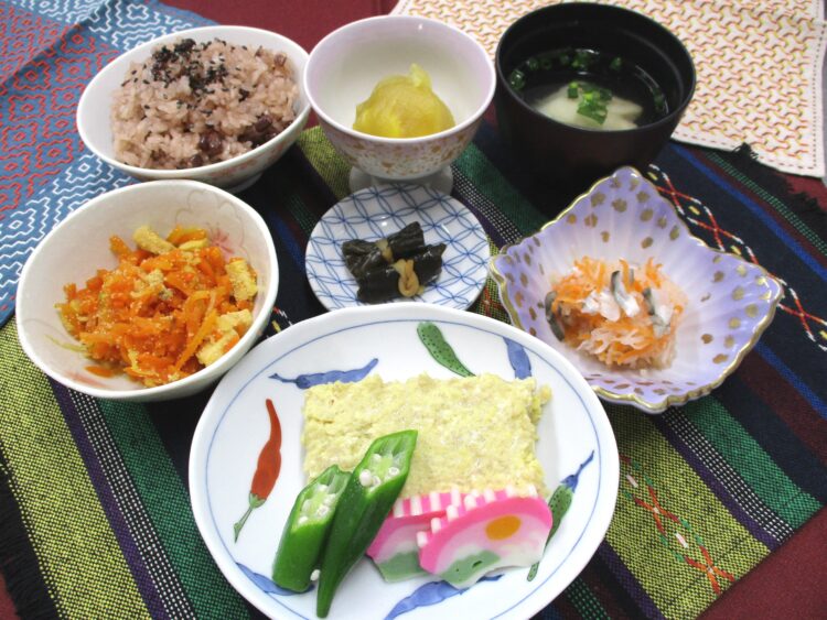 お赤飯、赤魚のすまし汁、鶏肉の松風焼き、栗きんとん、人参の子和え、氷頭なます、一口昆布巻