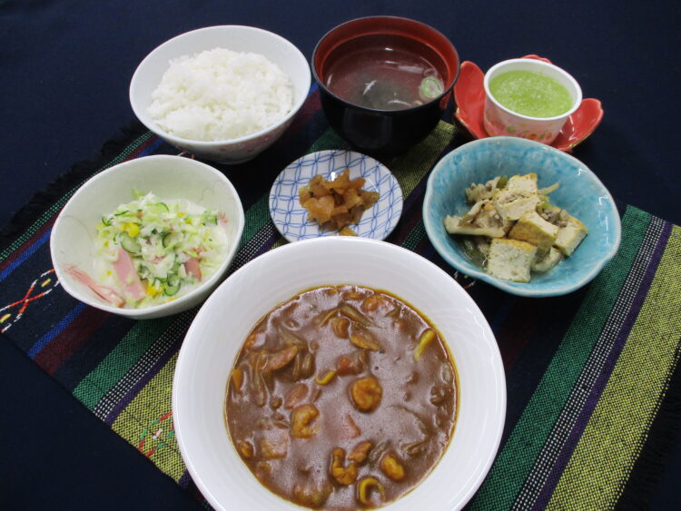 ご飯、わかめスープ、シーフードカレー、コールスローサラダ、生揚げと舞茸のそぼろ炒め、福神漬、青りんごゼリー