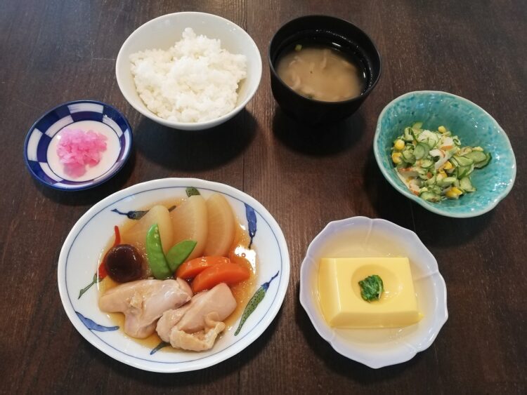 ごはん、舞茸のみそ汁、治部煮、たまご豆腐、胡瓜とわさびのマヨ和え、桜大根漬け