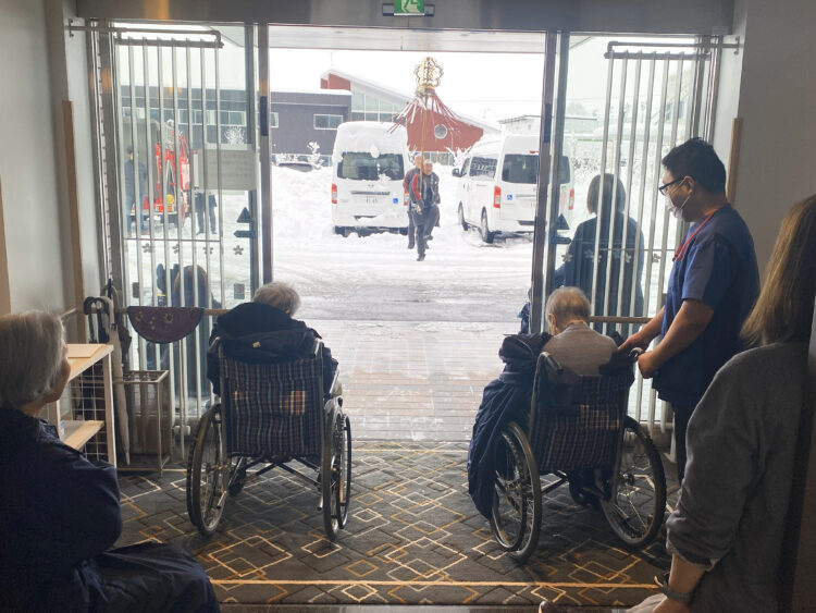 ショートステイお客様は「自分の旦那も纏振りやっていた、懐かしい」と手を合わせて纏振りを見ていました
