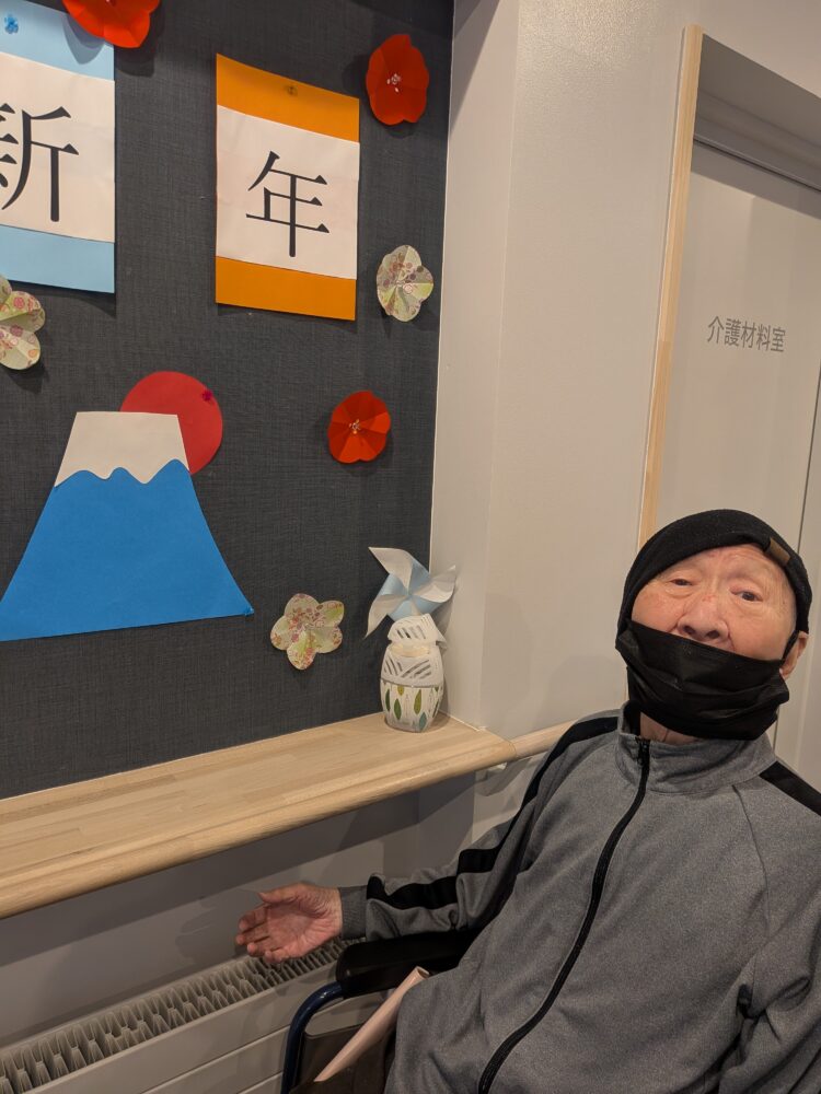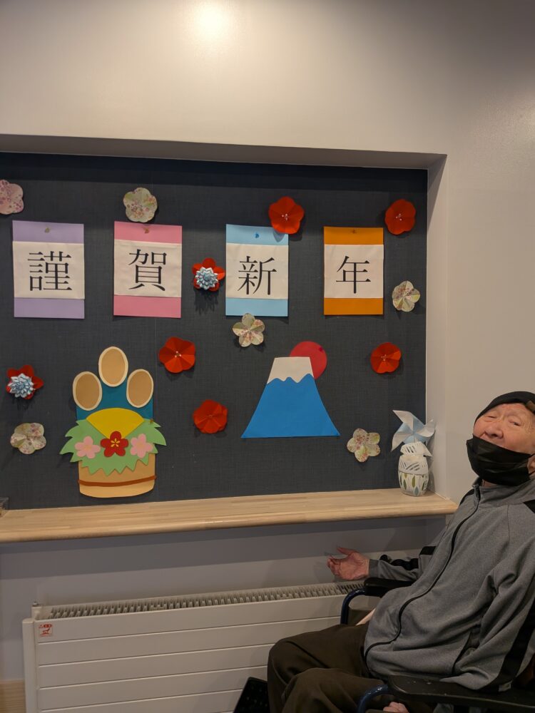 「謹賀新年」の掲示物の前では、利用者さんがくつろぎながら、ゆったりとした表情を見せてくださいました😊