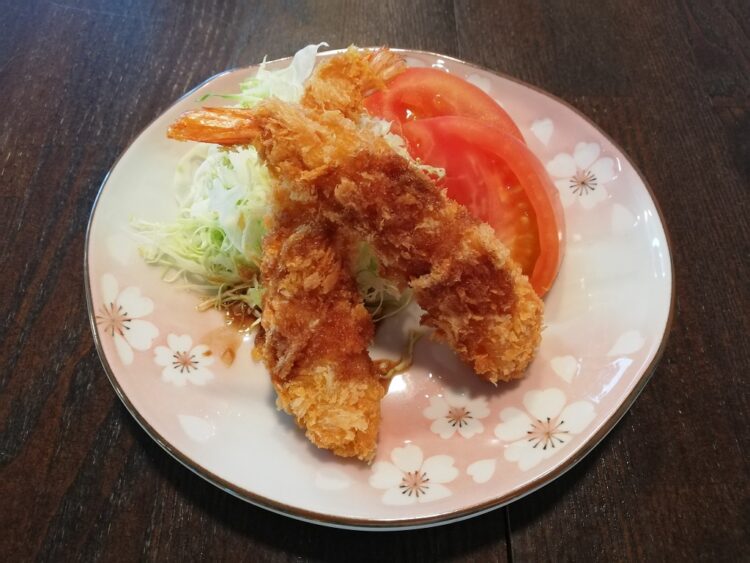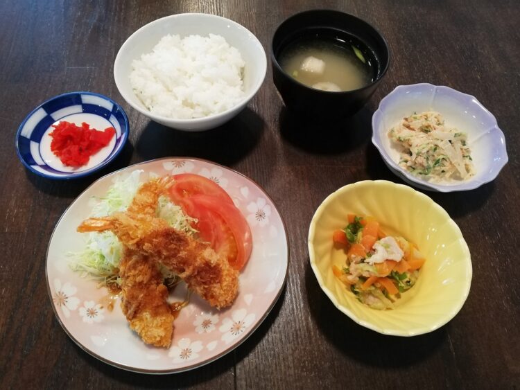 ごはん、麩のみそ汁、えびフライ、白菜と豚肉の炒め物、ツナサラダ、福神漬け