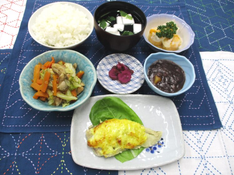 ご飯、はんぺんと三つ葉の清汁、たらの黄金焼き、キャベツと鶏肉の炒め物、