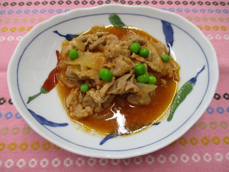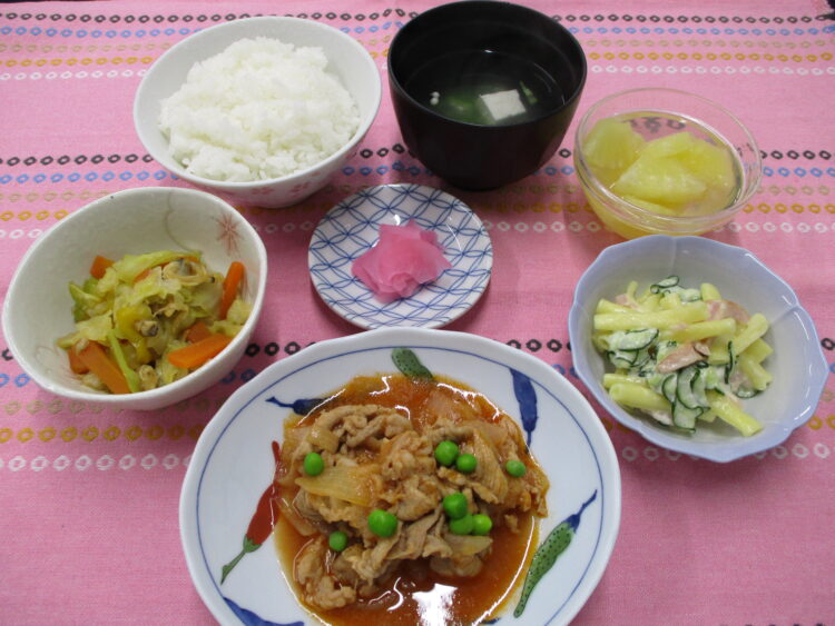 ご飯、豆腐とオクラのスープ、ポークケチャップソテー、キャベツとあさりのソテー、マカロニサラダ、桜大根漬、パイン缶