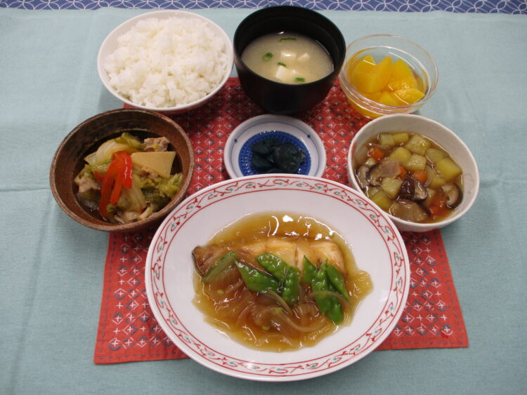 ご飯、豆腐と万能ねぎのみそ汁、ホキの甘酢あんかけ、白菜とたけのこの中華炒め、練り込み、なす漬、黄桃缶