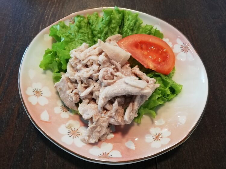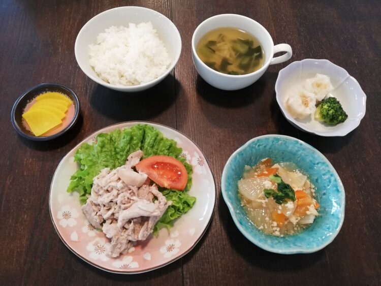 ごはん、たけのこの中華風スープ、豚肉の塩だれ焼き、大根のそぼろ煮、蒸ししゅうまい、