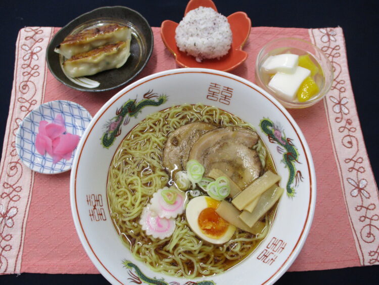 ゆかりおにぎり、醤油ラーメン、焼き餃子、桜大根漬、フルーツ杏仁豆腐