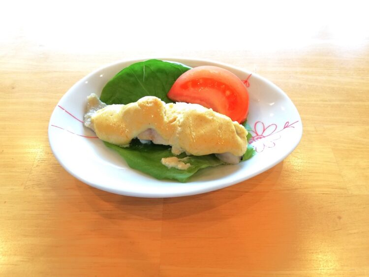 ごはん、ふきのみそ汁、白身魚のカレー風味焼き、長もやしの炒め物、卯の花の炒り煮、のり佃煮