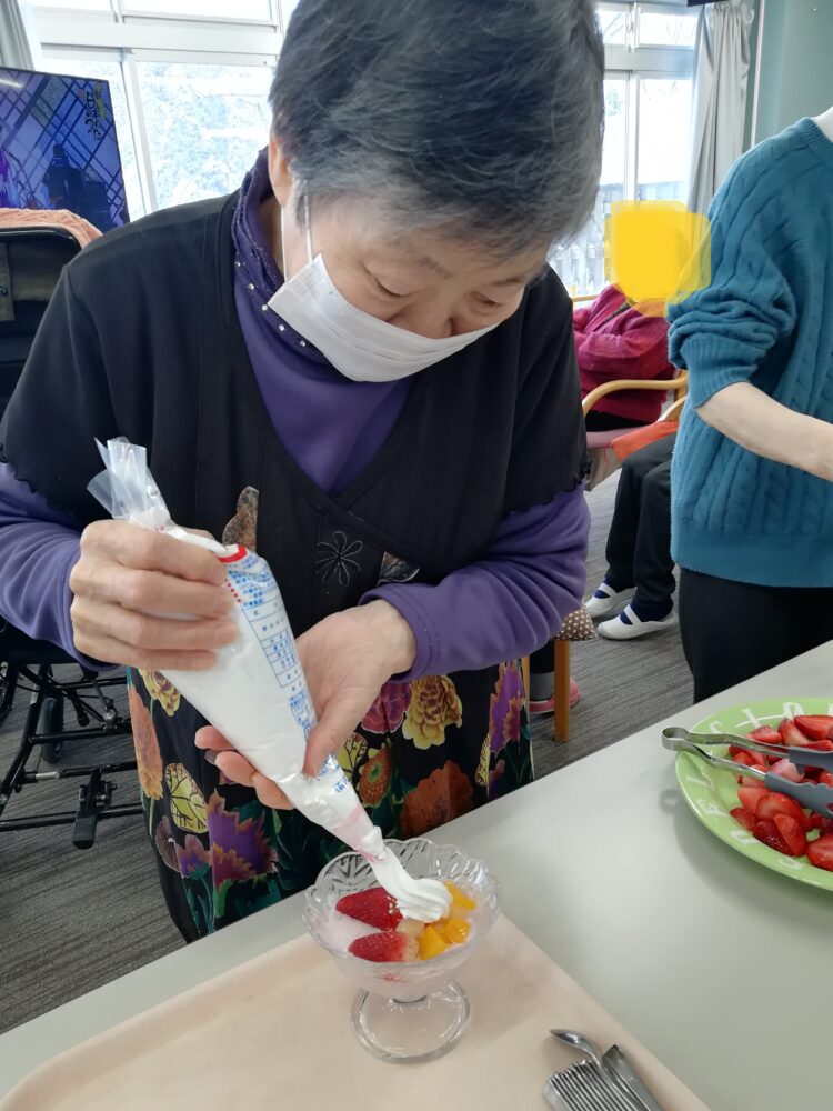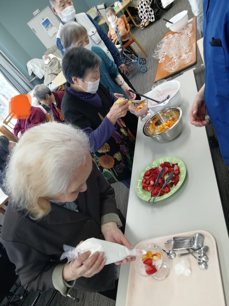 本日はおやつ喫茶でした!フルーチェを混ぜてもらい、フルーツやイチゴ、生クリーム等自分で盛り付けしてもらいました✨