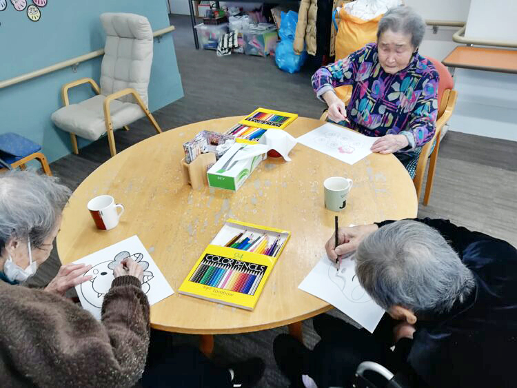 壁紙は薄いピンク色で・・・・塗り絵は2月のイベントである節分の鬼・お多福、また梅の花を塗って頂きました。