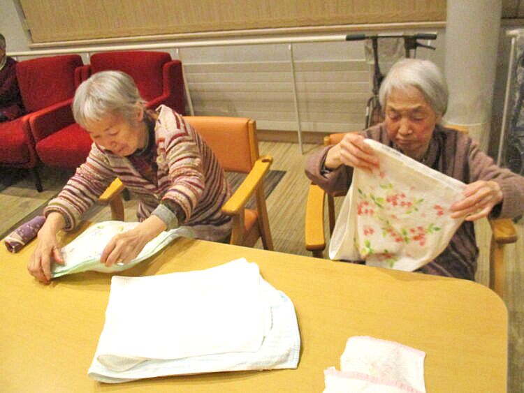 さて、本日は、タオル畳みを手伝って頂きました。「どれ~」と笑顔でタオルを受け取り、すぐに、真剣な表情で、タオルを畳んでくれました。