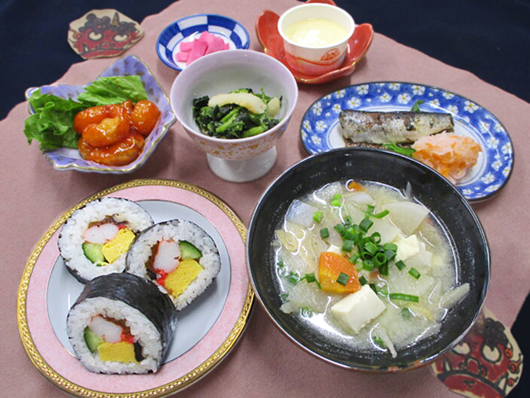 太巻き寿司、けんちん汁、いわしの生姜煮、ほうれん草のピーナッツ和え、えびチリ、赤かぶ漬、豆乳プリン