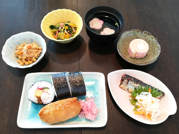 太巻き・いなり寿司、花麩のすまし汁、いわしの梅煮、鶏五目豆、青梗菜の和え物、ロールケーキ