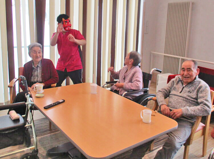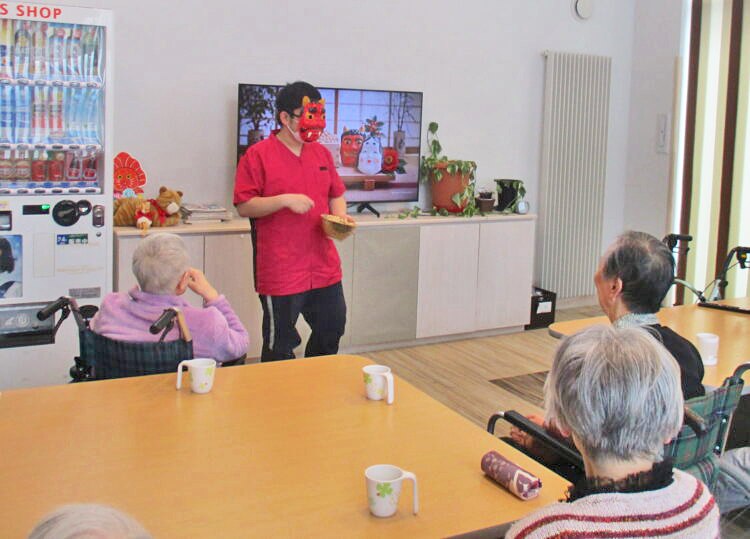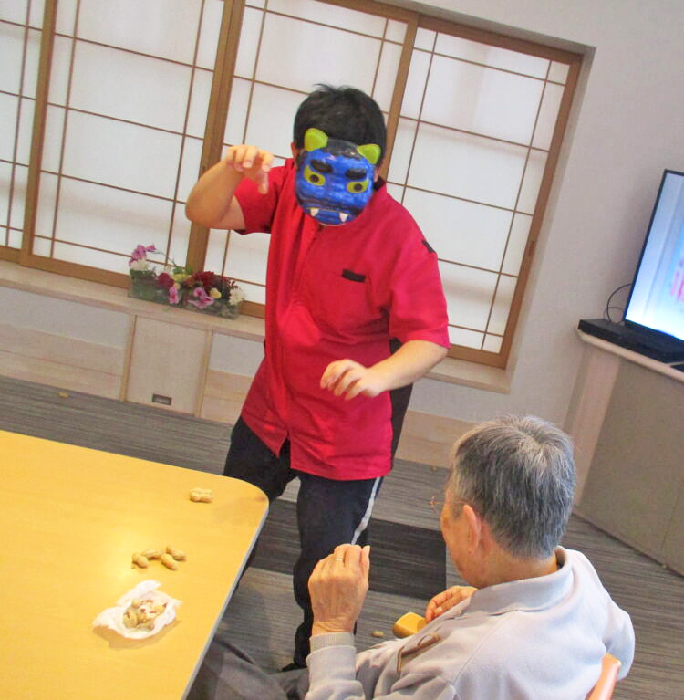 ブログをご覧の皆様、こんばんは。本日は節分ということで、職員が鬼に扮し、お客様に豆を撒いて頂きました。皆様、一生懸命に赤鬼、青鬼に向かって豆を投げ、「鬼はー外ー」「福はー内ー」と元気の良い掛け声を上げておりました。