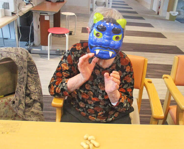 「わぁも、被ってみようかな」と話し、青鬼のお面を着けるT様。職員や他のお客様に「似合ってる?」と笑顔で聞いておりました。