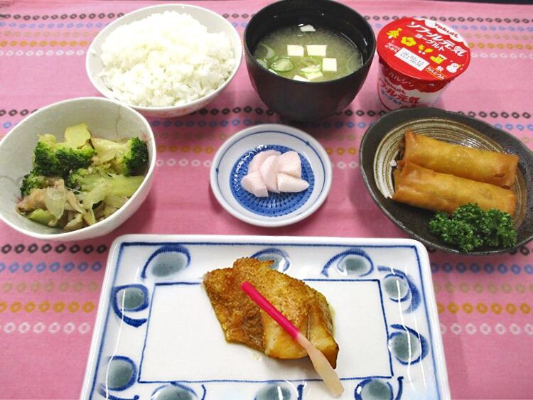 ご飯、豆腐とねぎのみそ汁、赤魚の南部焼き、ブロッコリーと鶏肉のソテー、春巻き、長いも漬、