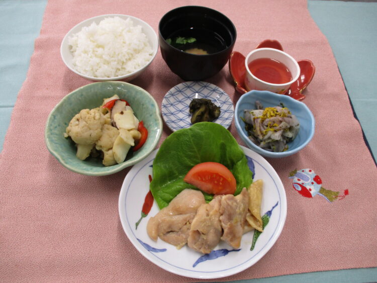 ご飯、なると三つ葉の清汁、鶏肉の味噌漬け焼き、カリフラワーといかのソテー、かぶのゆかり和え、相馬きゅうり漬、ぶどうゼリー