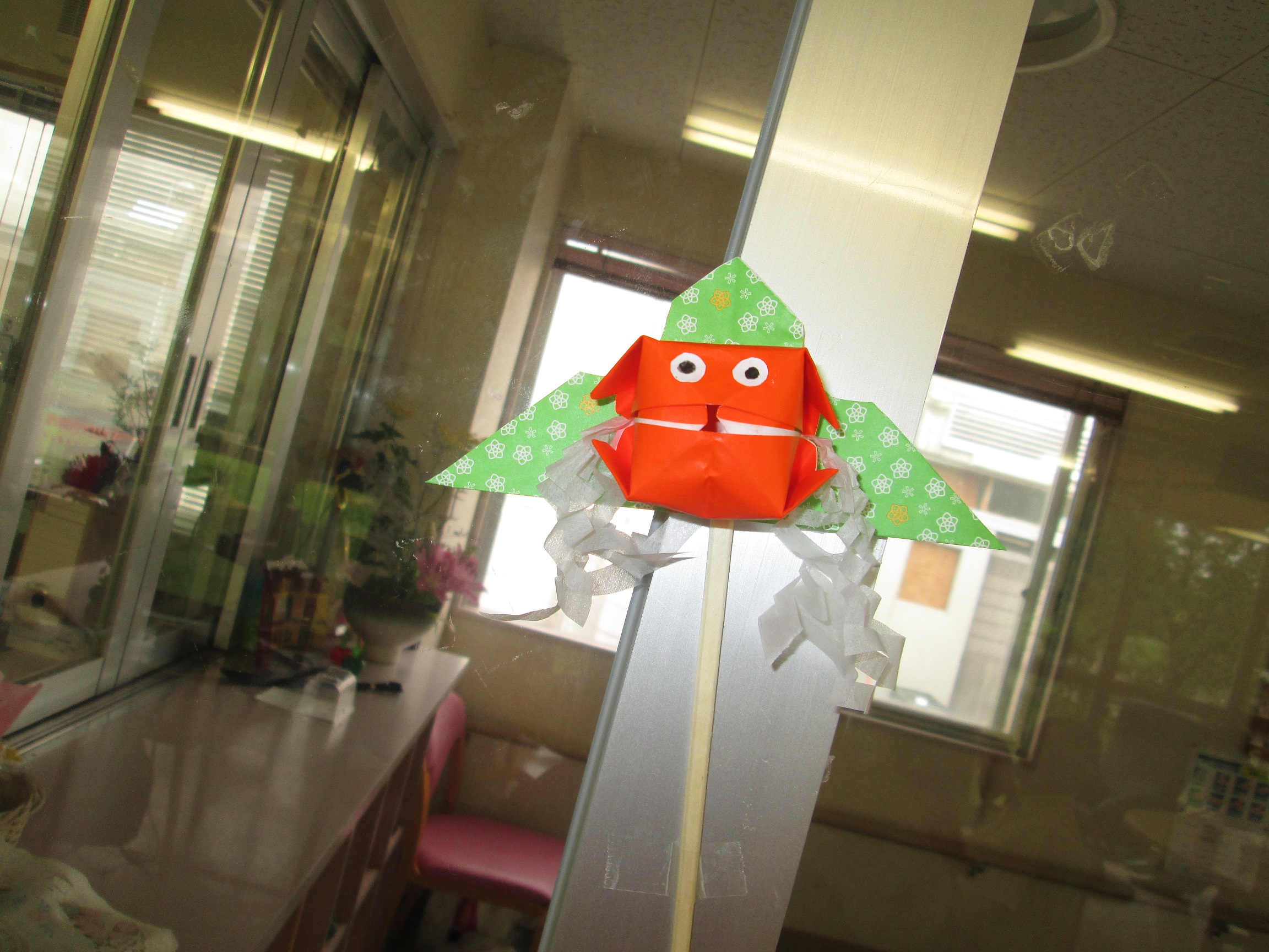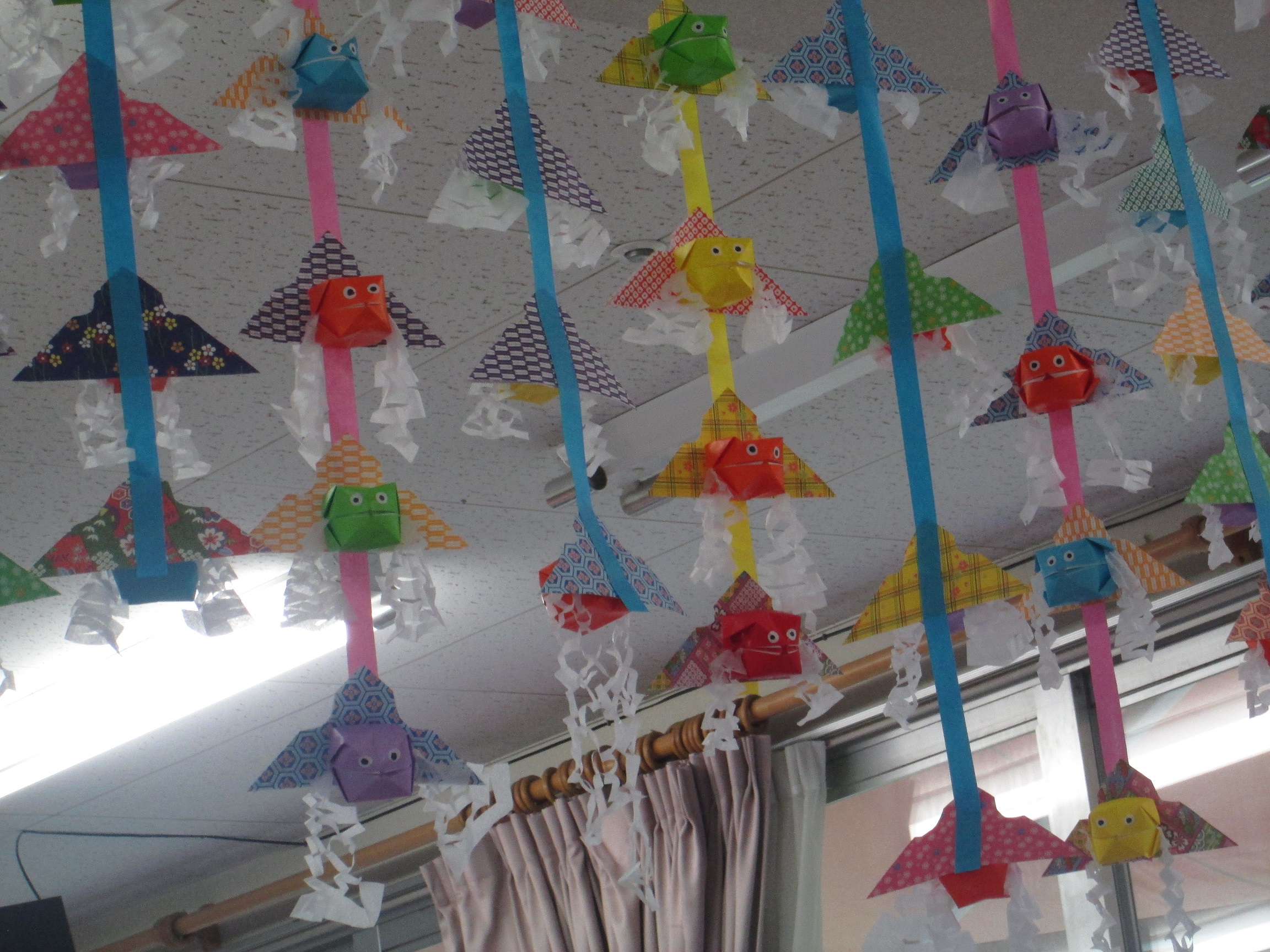 デイサービスフロアでは、お客様皆さんで作った色とりどりの金魚ねぷたが泳いでいます!夢中で折ってくれた金魚が気づくと100個弱ありました!!!